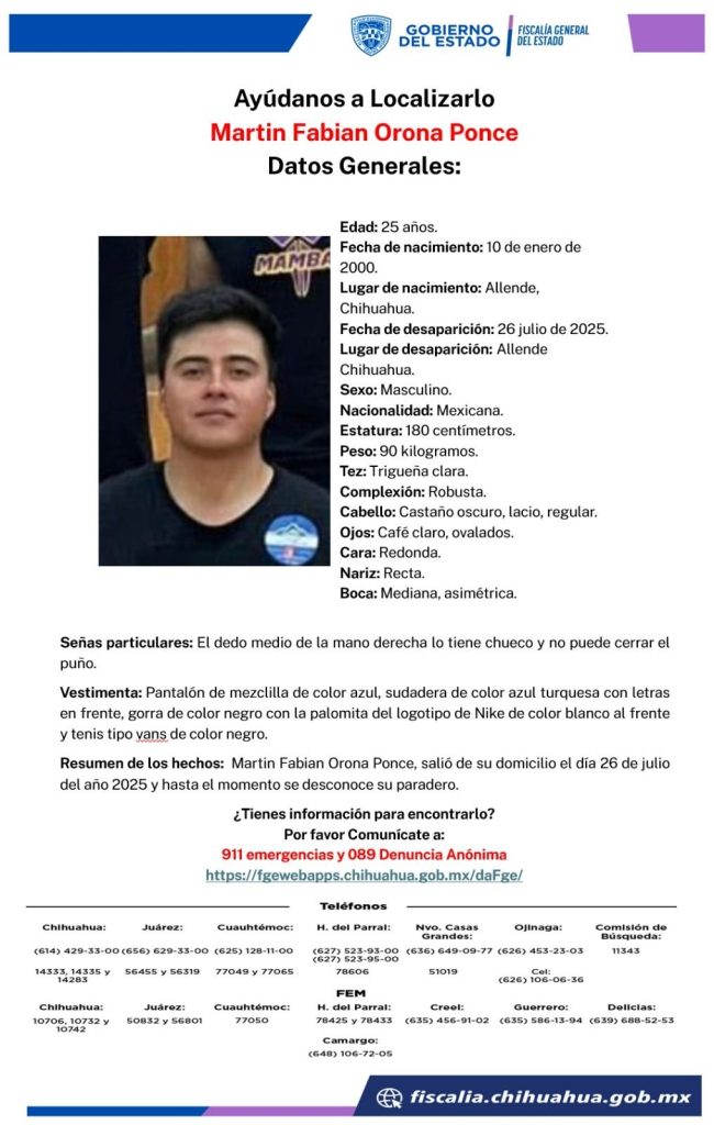 La Fiscalía General del Estado emitió una pesquisa para localizar a Martín Fabián Orona Ponce, joven de 25 años que fue reportado como desaparecido el pasado 26 de julio de 2025, fecha en que salió de su domicilio en el municipio de Allende y desde entonces se desconoce su paradero.