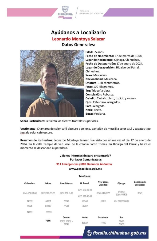 De acuerdo con el reporte, el hombre de 55 años fue visto por última vez el 17 de enero del 2024 en la calle Templo de San José en la colonia Santo Tomás, en la ciudad de Parral.