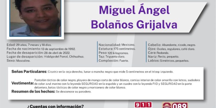 De acuerdo con la descripción proporcionada en el reporte, Miguel Ángel Bolaños Grijalva mide 1.75 metros, es de complexión fuerte, abundante y rizado de color negro, tez trigueña clara, ojos café claro, cara redonda, nariz recta y labios pequeños.