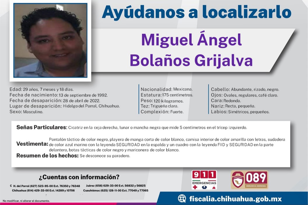 Si cuenta con información que ayude a dar con su paradero, favor de comunicarse al número de Emergencias 9-1-1 o Denuncia Anónima 089, también través de la plataforma www.pasaeldato.gob.mx y en el teléfono 614-429-33-00, extensiones: 76350 y 76348.