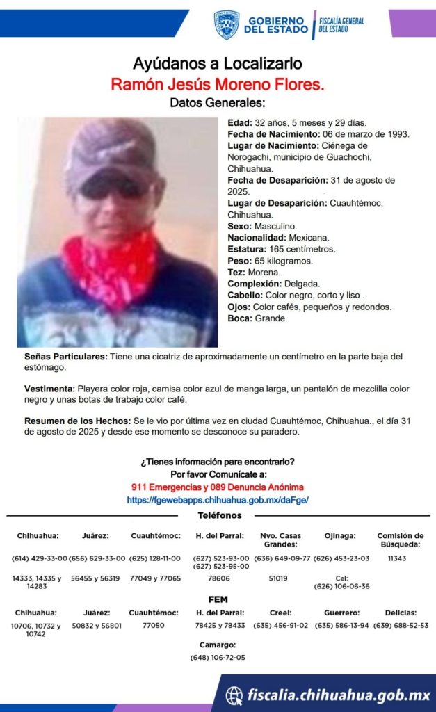 La Comisión de Búsqueda de Personas lanzó un llamado a la ciudadanía para colaborar en la localización de Ramón Jesús Moreno Flores, de 32 años, quien fue visto por última vez el 31 de agosto de 2025 en la ciudad de Cuauhtémoc, sin que hasta ahora se tenga información sobre su paradero.
