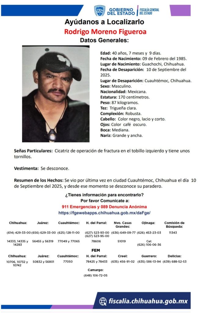 La Fiscalía General del Estado solicita la colaboración de la ciudadanía para localizar a Rodrigo Moreno Figueroa, de 40 años, reportado como desaparecido desde el pasado 10 de septiembre de 2025, fecha en que se le vio por última vez en la ciudad de Cuauhtémoc, Chihuahua.