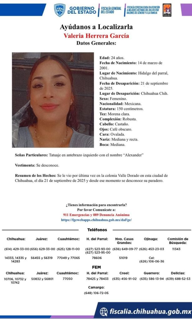 La Fiscalía de Distrito Zona Centro emitió una pesquisa para localizar a Valeria Herrera García, joven de 24 años de edad, originaria de Hidalgo del Parral, quien fue vista por última vez el 21 de septiembre de 2025 en la colonia Valle Dorado, en la ciudad de Chihuahua.