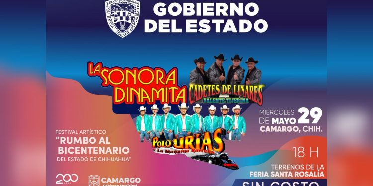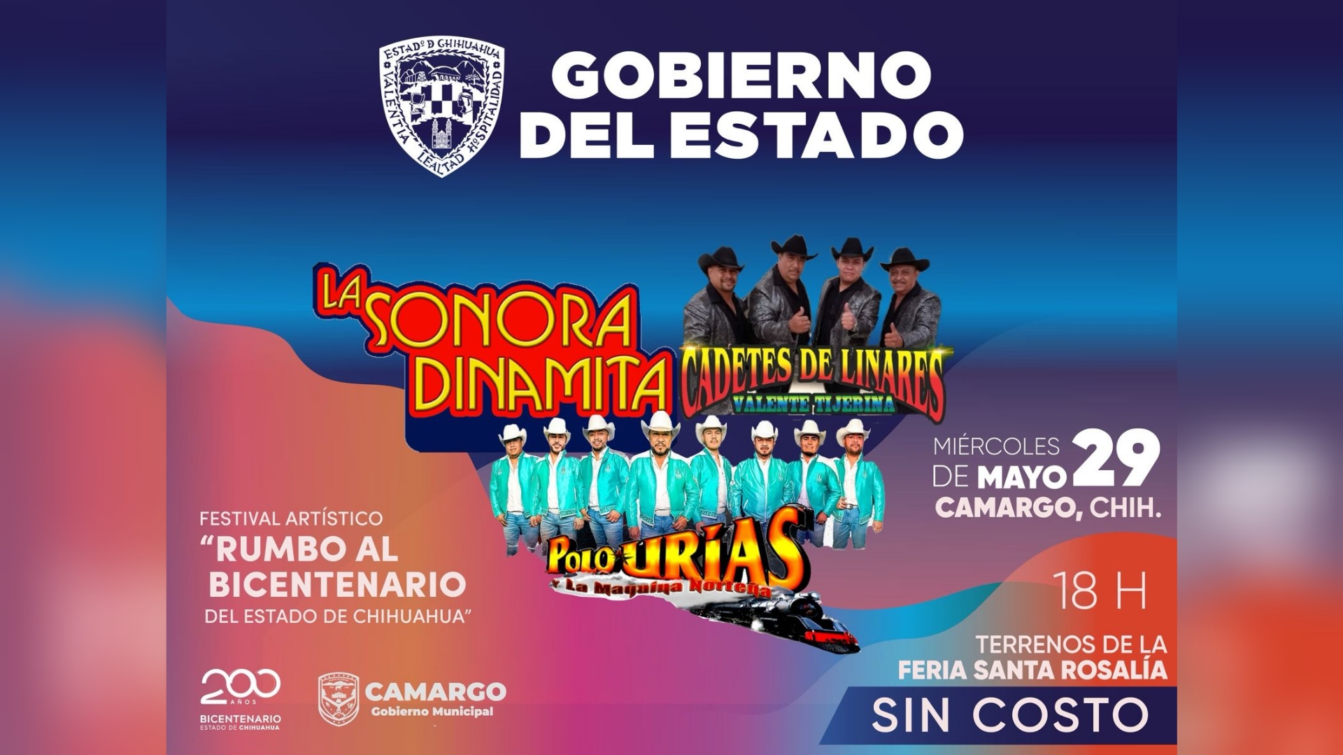 Como parte de las actividades que integran el Festival Artístico “Rumbo al Bicentenario del Estado de Chihuahua”, la Secretaría de Cultura, en coordinación con el Gobierno Municipal de Camargo, invitan a la presentación de Los Cadetes de Linares, La Sonora Dinamita, Polo Urías y la Máquina Norteña.