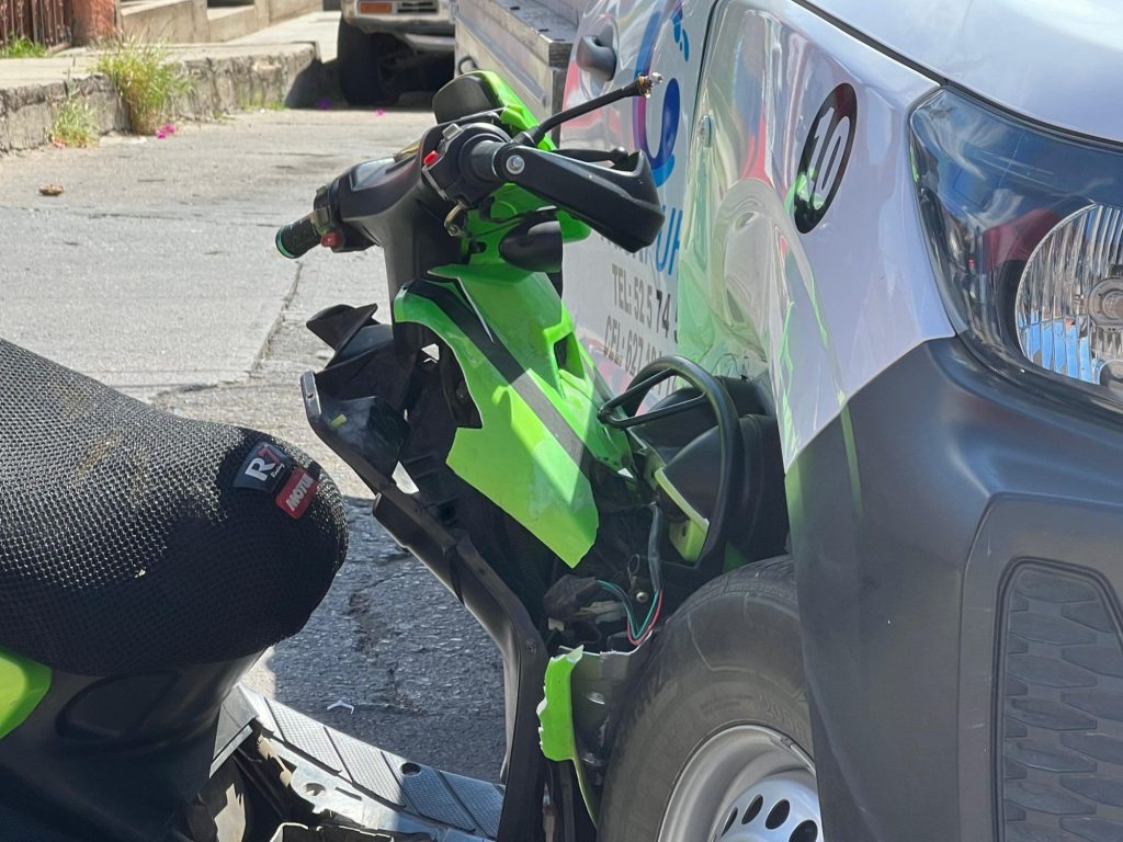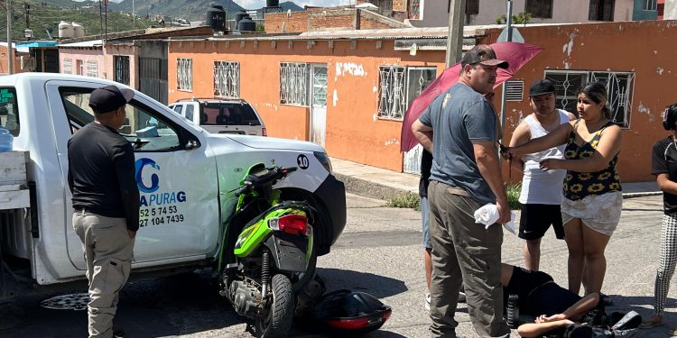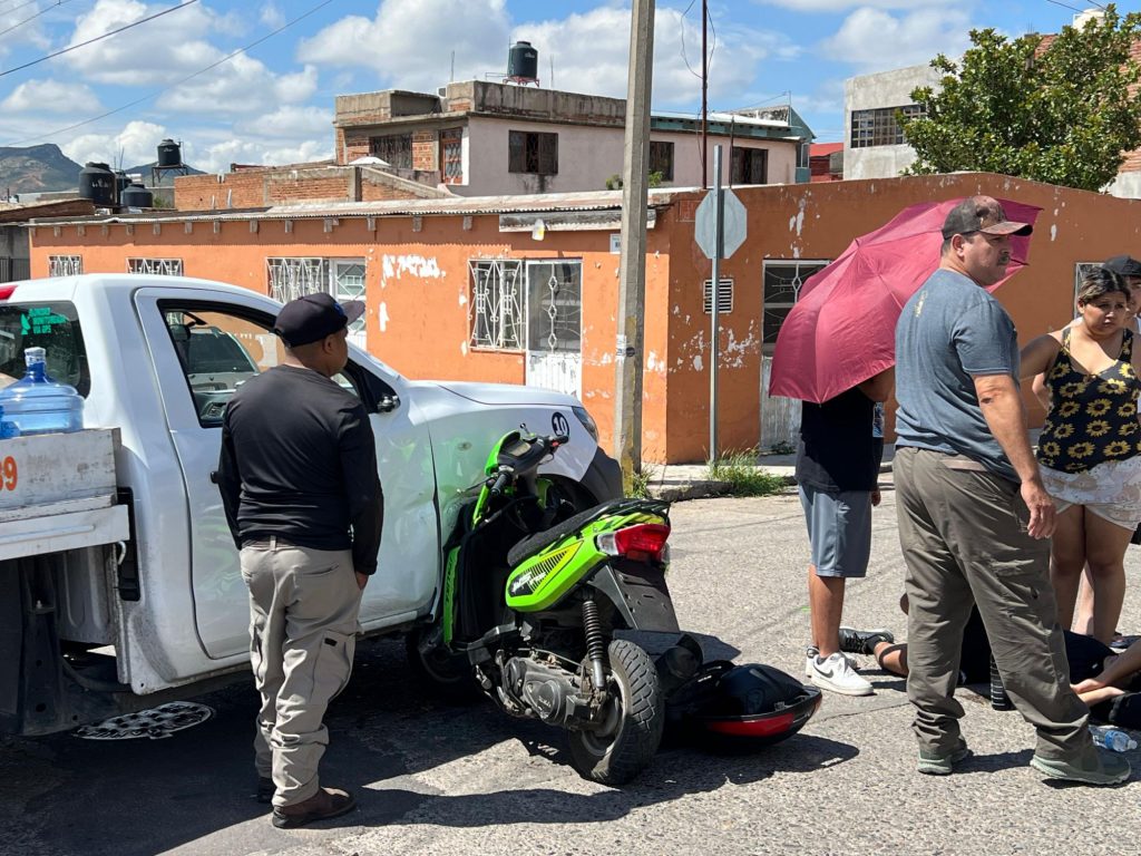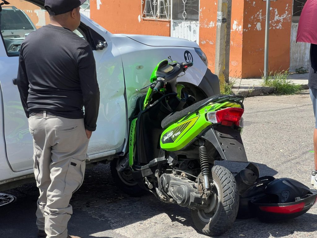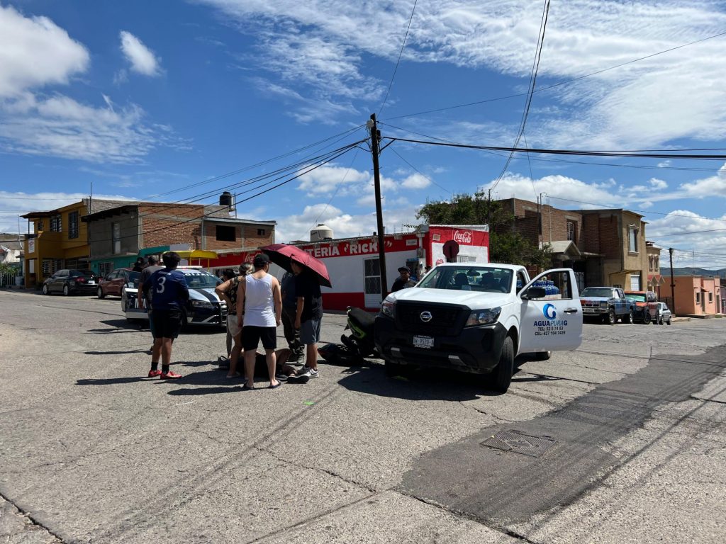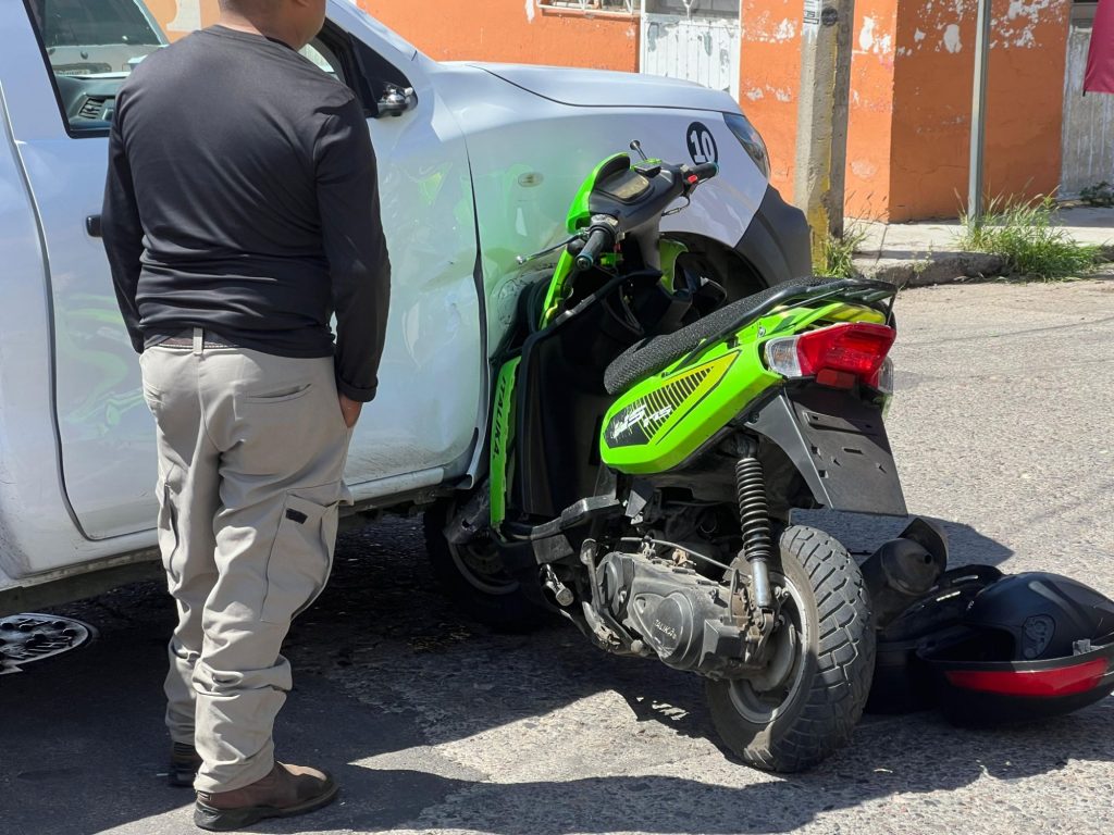 El accidente ocurrió en la calle Río Lerma, donde una Nissan NP300 de una empresa particular, no respetó el alto y ocasionó que un motociclista en una unidad verde de dos ruedas marca Italika, la impacta en el lateral del copiloto.