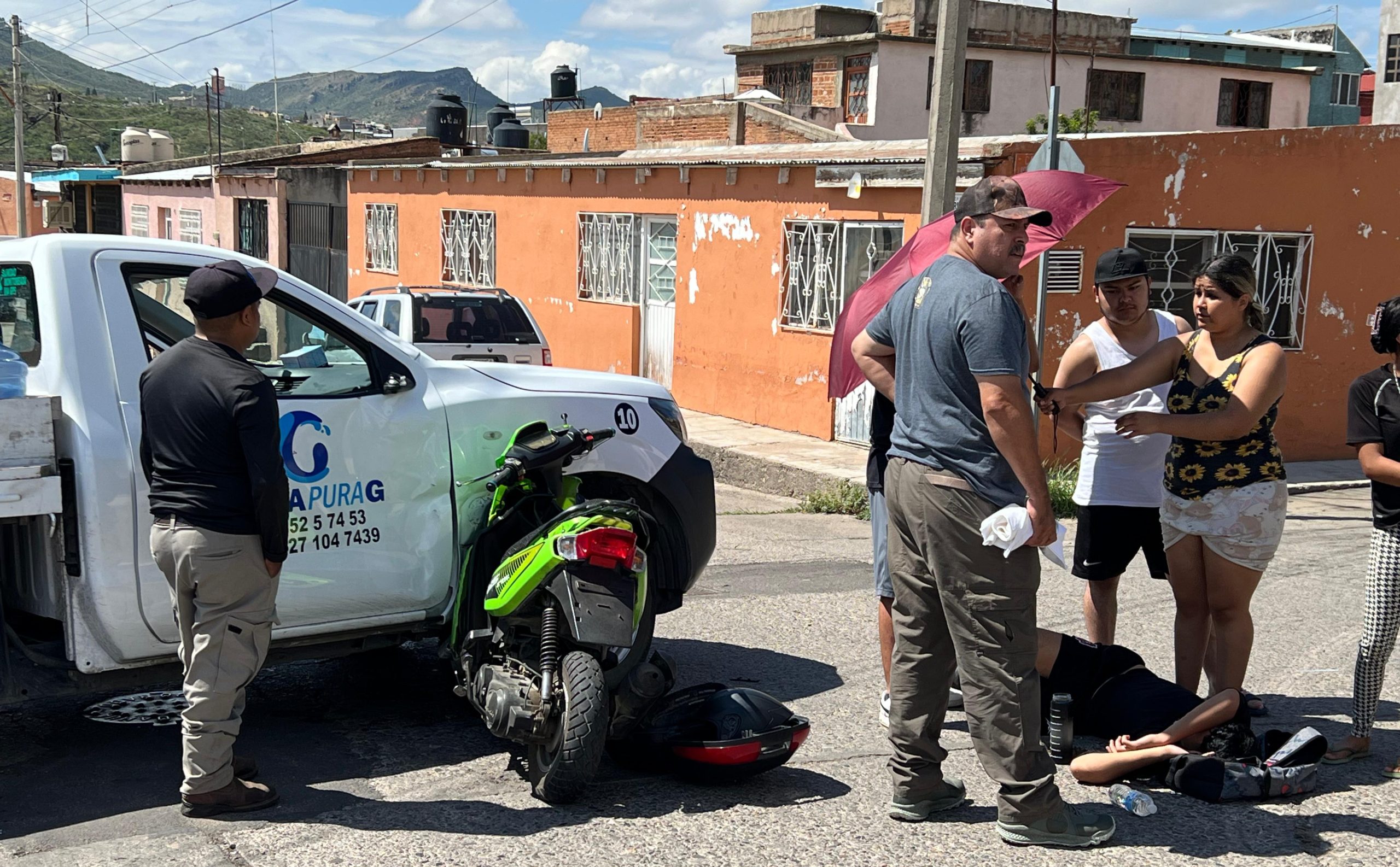 Una camioneta repartidora de agua potable en garrafón, se pasó su alto correspondiente, provocando un choque lateral contra una motocicleta.