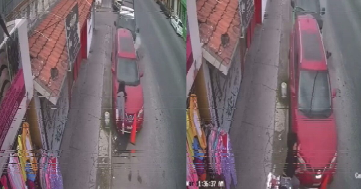 La mujer está en la orilla de la banqueta quitando unos conos de la calle, cuando la patrulla la atropella de forma indirecta.