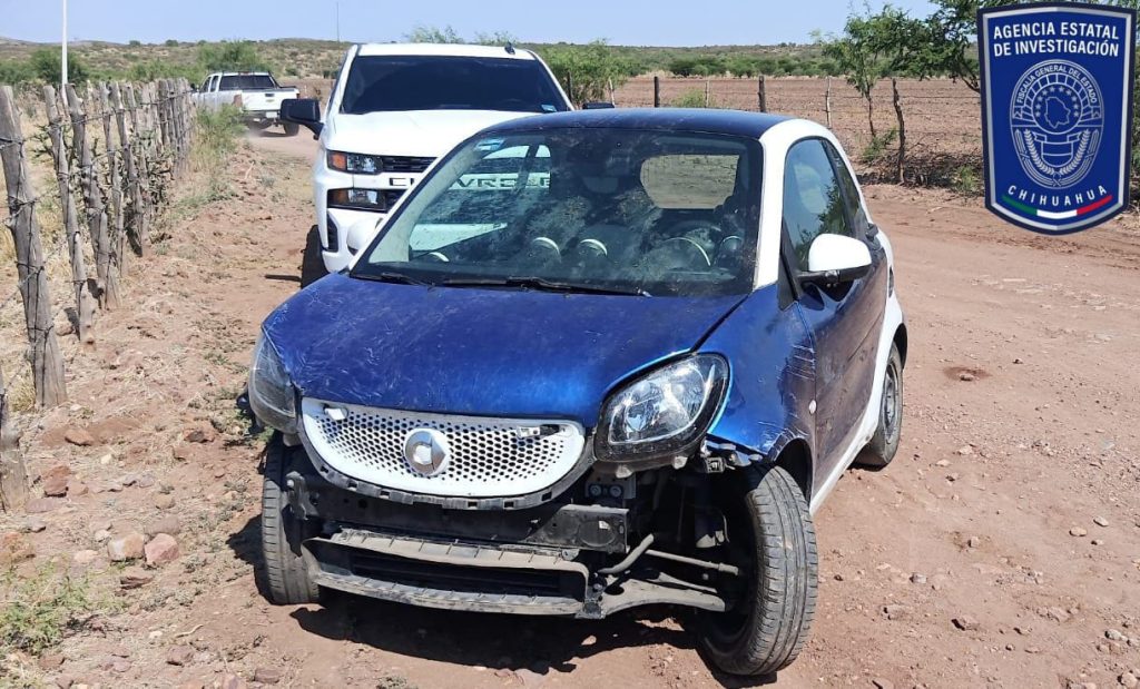 Posteriormente, al continuar las investigaciones, en la carretera Parral – Chihuahua, a la altura de la brecha que conduce a El Vigía, se localizó abandonado el automotor Smart tipo sedán, color azul, modelo 2016, el cual, al revisar en el Sistema SILVER, arrojó un reporte de robo del día 18 de junio del 2023, en la ciudad de Chihuahua.