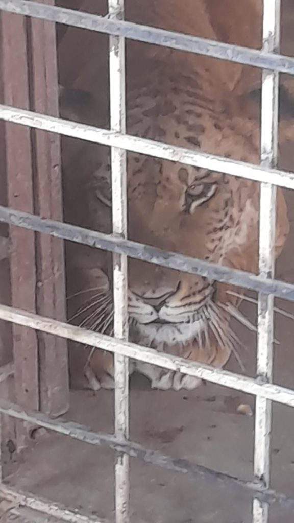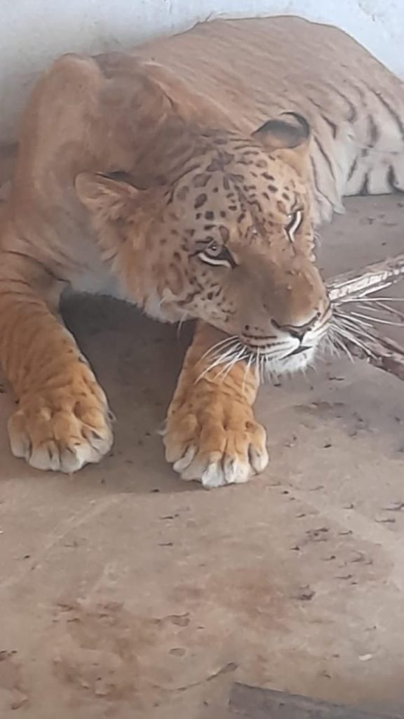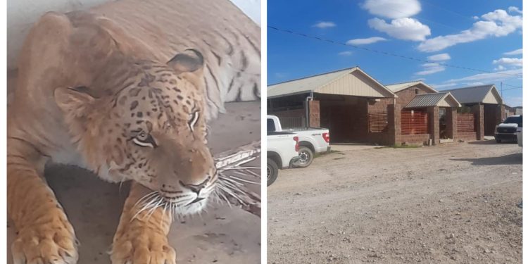 En el patio de una de las viviendas, encontraron un felino cruza de un león con una tigresa, de una edad promedio de un año dos meses, estaba dentro de una jaula, aparentemente en buenas condiciones de salud.
