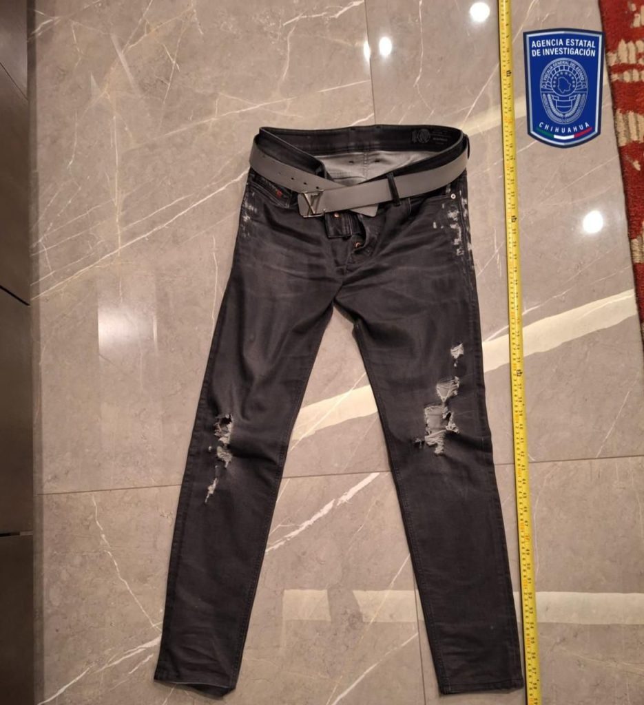 - Pantalón de mezclilla de color oscuro rasgado con la leyenda Sleenker y cinto de color gris con hebilla de color plateada “LV”.
