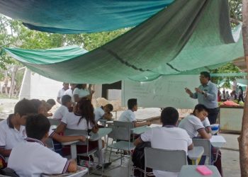 Leer másSin salones y en sillas blancas de plástico apoyadas en piso de terracería, estudiantes de la...