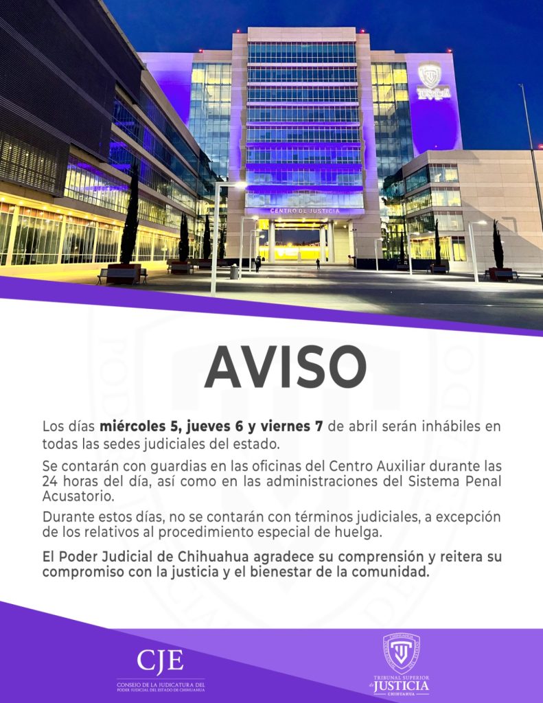 El Poder Judicial de Chihuahua informa a las y los usuarios que, de acuerdo con el calendario judicial 2023, los miércoles 5, jueves 6 y viernes 7 de abril serán inhábiles en todos los distritos judiciales del estado.
