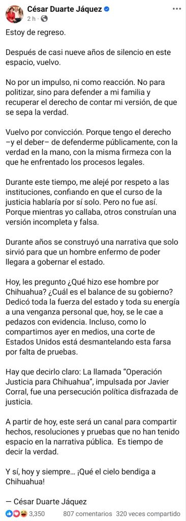 Luego de casi nueve años de ausencia en redes sociales, el exgobernador de Chihuahua, César Duarte Jáquez, reapareció públicamente este jueves a través de una publicación en su cuenta oficial de Facebook, en la que afirma que retomará el uso de ese espacio para defender su nombre y el de su familia, además de ofrecer su versión sobre los procesos judiciales que enfrenta.