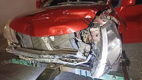 El conductor de un Nissan Tida rojo modelo 2010, chocó contra un Ford Mustang blanco 2016, con resultado de considerables daños materiales.