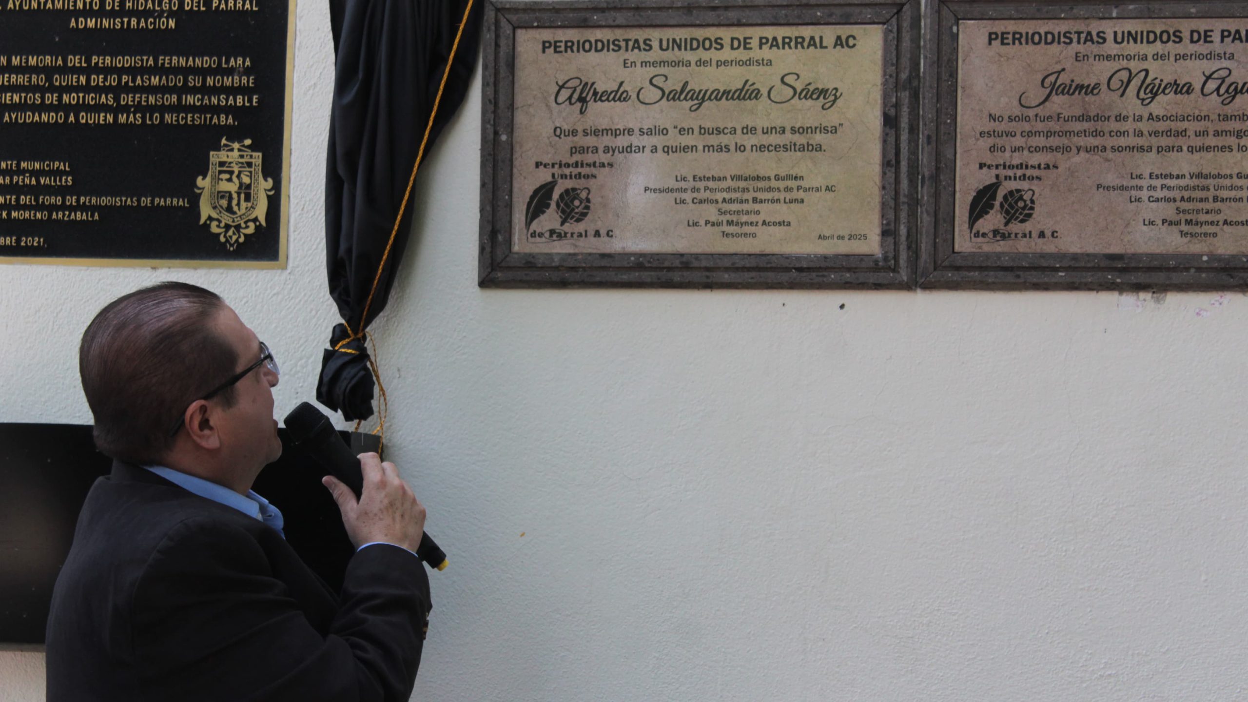 El presidente Municipal de Parral, Salvador Calderón, encabezó la ceremonia de develación de placas conmemorativas en honor a tres destacados periodistas locales: Alfredo Salayandia, Jaime Nájera y José Luis Reyes, en un acto de reconocimiento a su amplia trayectoria, compromiso informativo y entrega al servicio público.