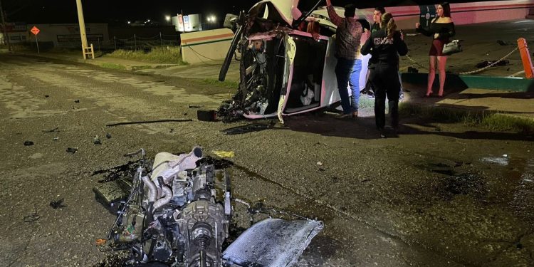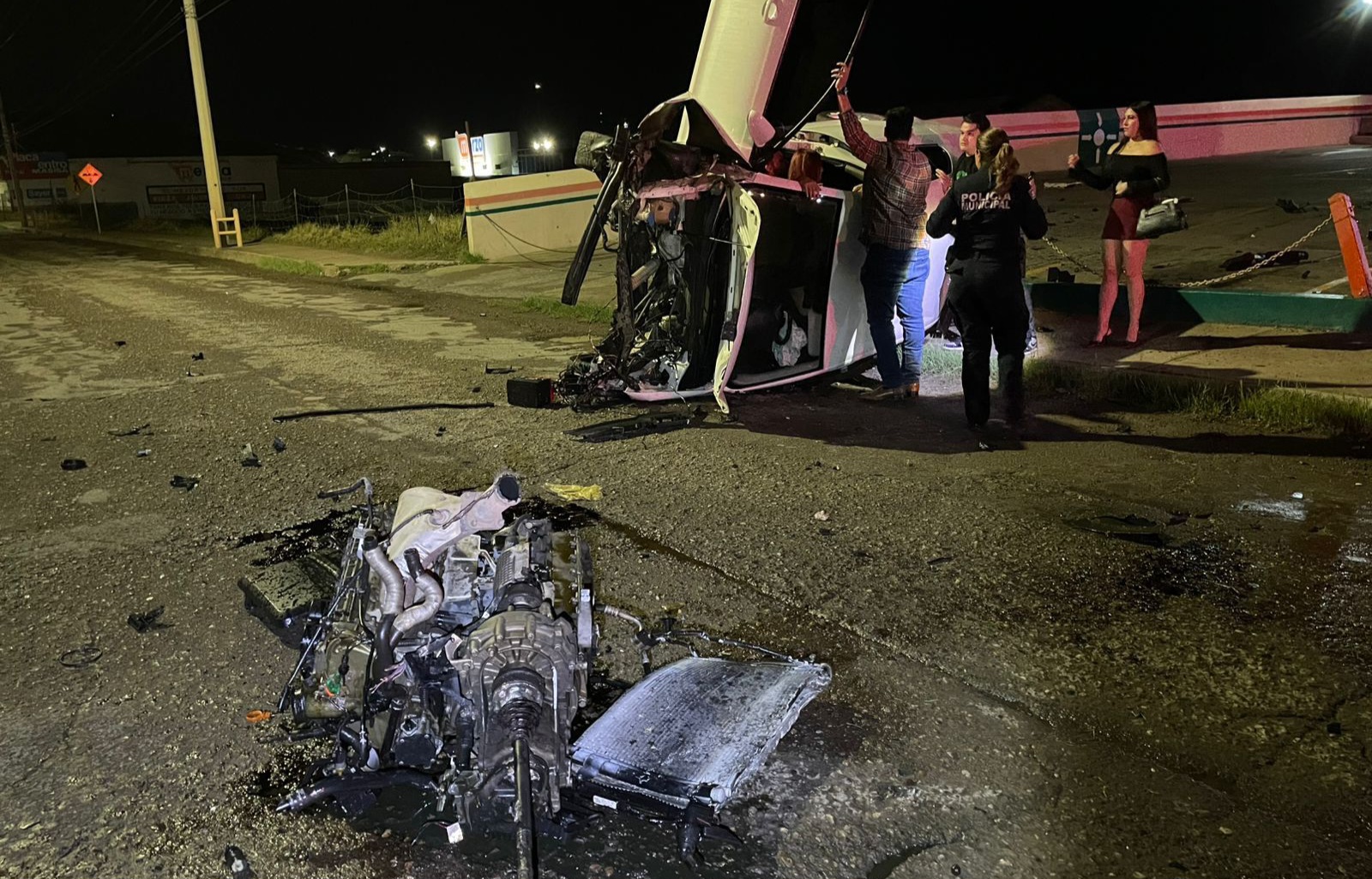 La fuerza del golpe fue tal que el vehículo terminó volcado y, derivado del impacto, el motor salió proyectado del automóvil y quedó sobre el asfalto, lo que refleja la magnitud del percance.