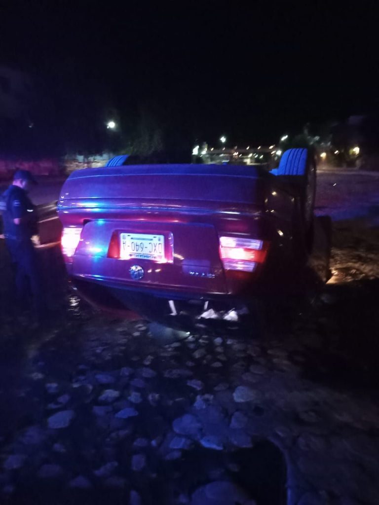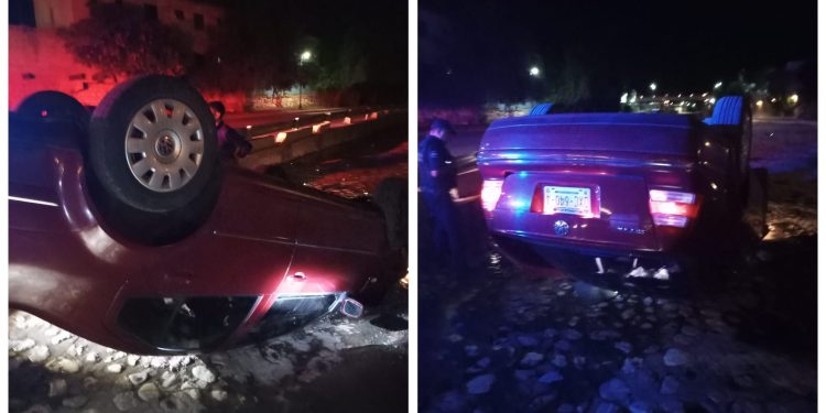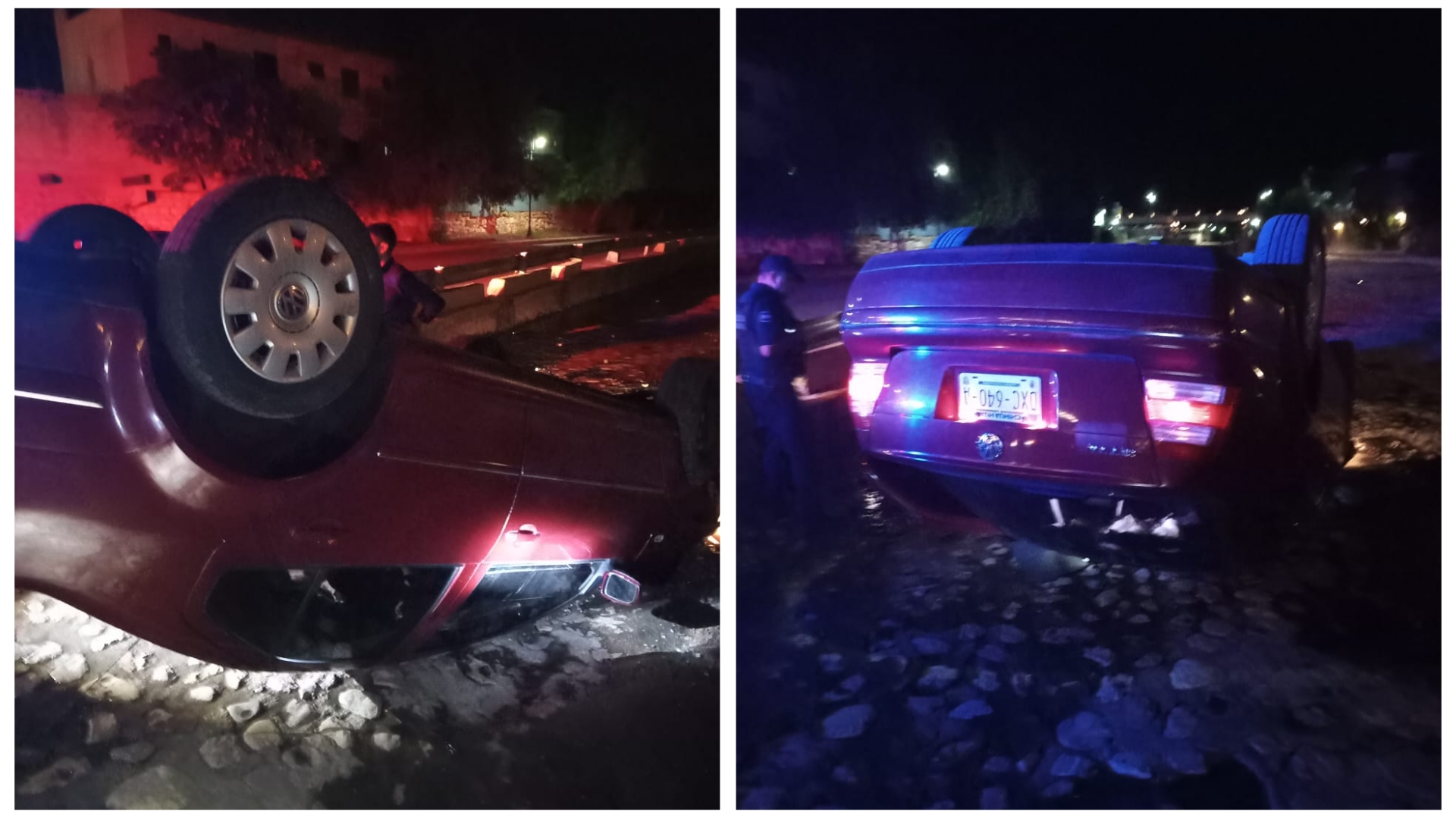 Un Volkswagen Jetta modelo 2007 color guinda, con placas del estado de Chihuahua, se impactó contra el muro de contención al circular por la Vialidad del Río y terminó con las cuatro llantas hacia arriba.