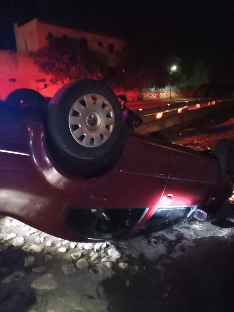 El choque hizo que diera una vuelta directa sobre su propio eje quedando en posición anormal sobre el empedrado del río.