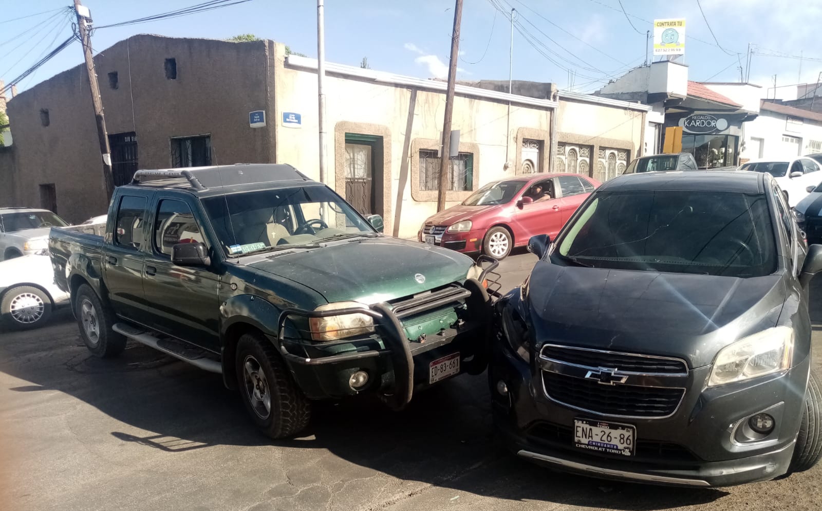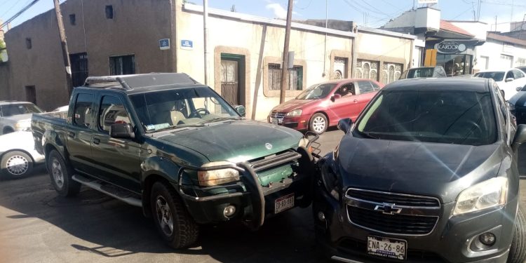 Tránsito tomó nota del hecho en el que participaron una camioneta Nissan Frontier de color verde modelo 2002 que conducía Juan Carlos G.I., misma que impactó a una GM Trax de color gris que en ese momento guiaba Kevin Gael G.T.