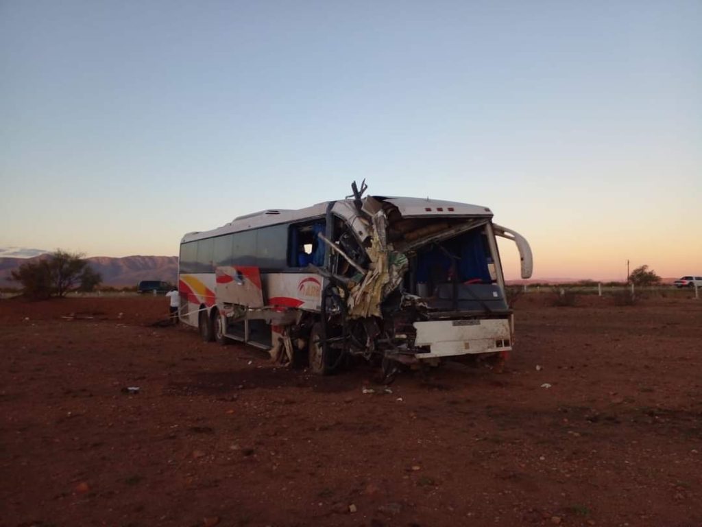De igual forma, pero fuera de la carpeta de rodamiento, en un campo a un costado derecho, se encontró un camión de pasajeros de la empresa Rápidos Delicias con daños materiales considerables en la parte lateral derecha, luego de chocar de forma lateral contra el tráiler antes mencionado.