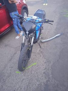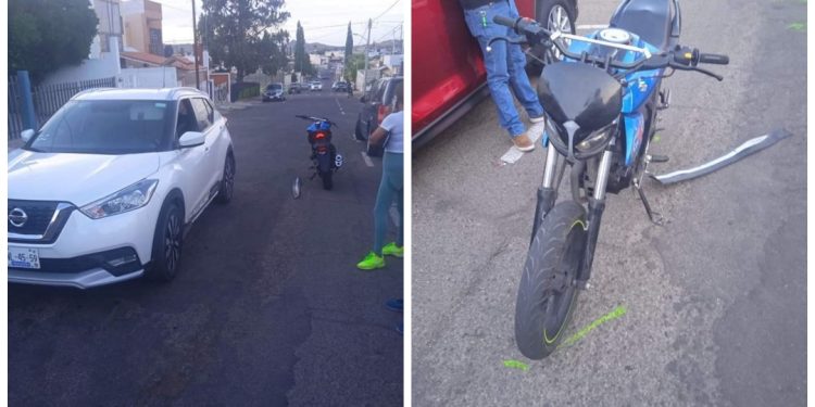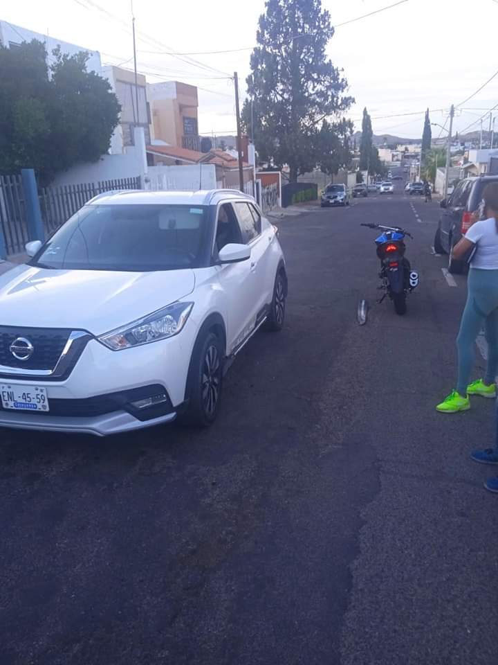 Por invadir el carril contrario al que circulaba, la  conductora de una Nissan Kicks provocó un choque contra una motocicleta en calles de la colonia Altavista.