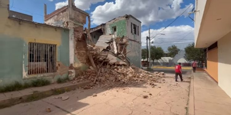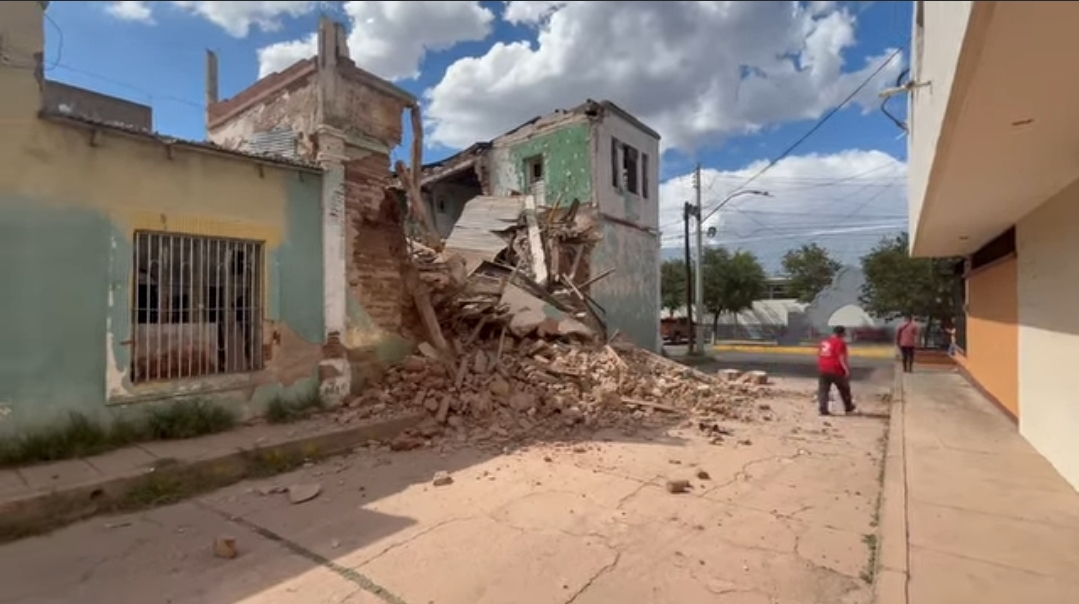 La tarde de este domingo se registró el colapso parcial de una estructura en desuso en la intersección de las calles Feliciano Domínguez y Parque del Niño, en pleno Centro de Parral, lo que activó una rápida movilización de personal de emergencia.