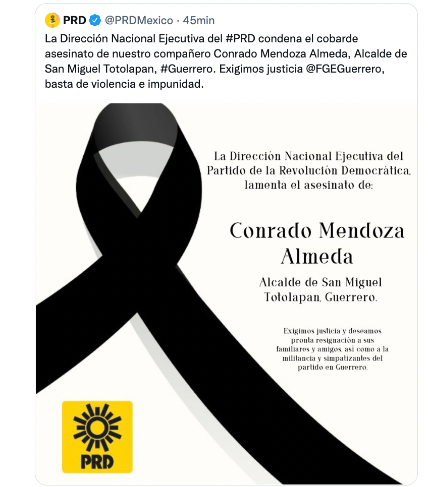 El PRD, a través de Twitter, condenó el homicidio del político y exigió justicia.
