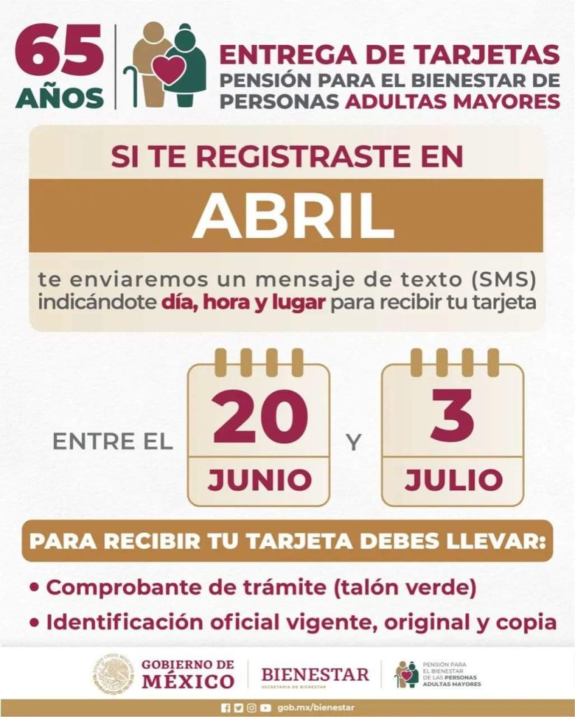 El subdelegado de la Secretaría de Bienestar para la región Sur del Estado, Fernando Duarte González, informó que entre el 20 de junio y el próximo 3 de julio, se estarán entregando las tarjetas de la pensión «65 y más» a los adultos mayores que se registraron el pasado mes de abril.