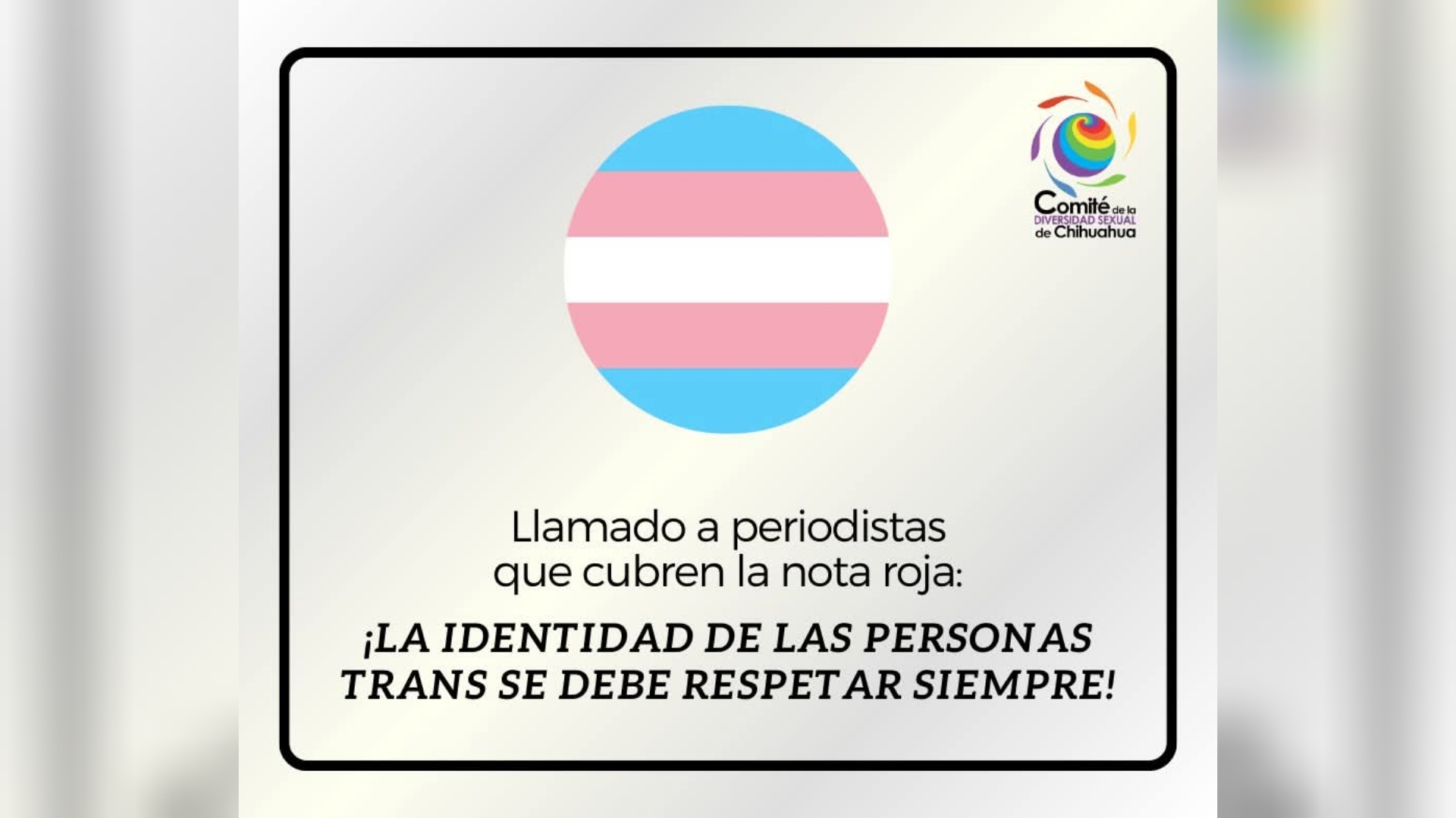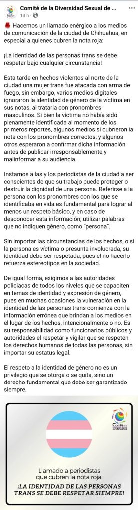 El Comité de la Diversidad Sexual de Chihuahua hizo un llamado enérgico a los medios de comunicación, en especial a quienes cubren la nota roja, a respetar la identidad de las personas trans bajo cualquier circunstancia.