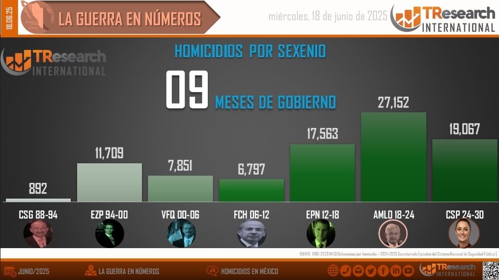 A nueve meses de haber iniciado el sexenio de la presidenta Claudia Sheinbaum (CSP 2024–2030), México registra un total de 19,067 homicidios, según datos de TR Research International basados en cifras del Secretariado Ejecutivo del Sistema Nacional de Seguridad Pública.