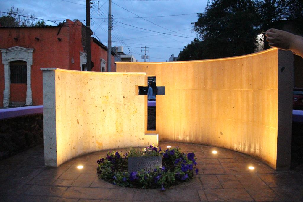 El memorial consta de muros semicirculares que se intersectan y completan entre ellos una cruz, al centro una jardinera con lavandas, obra que honra a todas las mujeres víctimas de feminicidio en Parral y tiene como objetivo recordar su memoria y exigir justicia para ellas.