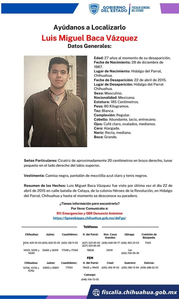 A más de nueve años de su desaparición, la Fiscalía General del Estado de Chihuahua mantiene activa la pesquisa para localizar a Luis Miguel Baca Vázquez, quien fue visto por última vez el 22 de abril de 2015 en la ciudad de Hidalgo del Parral.