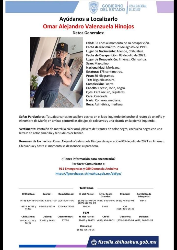 A casi un año de su desaparición, la Fiscalía General del Estado mantiene activa la búsqueda de Omar Alejandro Valenzuela Hinojos, quien fue visto por última vez el 3 de julio de 2023 en el municipio de Jiménez, Chihuahua.