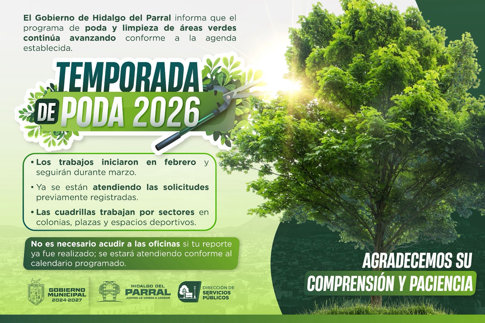 La Dirección de Servicios Públicos Municipales, informa a la ciudadanía sobre el progreso de la Temporada de Poda 2026, una acción estratégica para el mantenimiento del arbolado urbano y la eliminación de maleza en espacios comunes.
