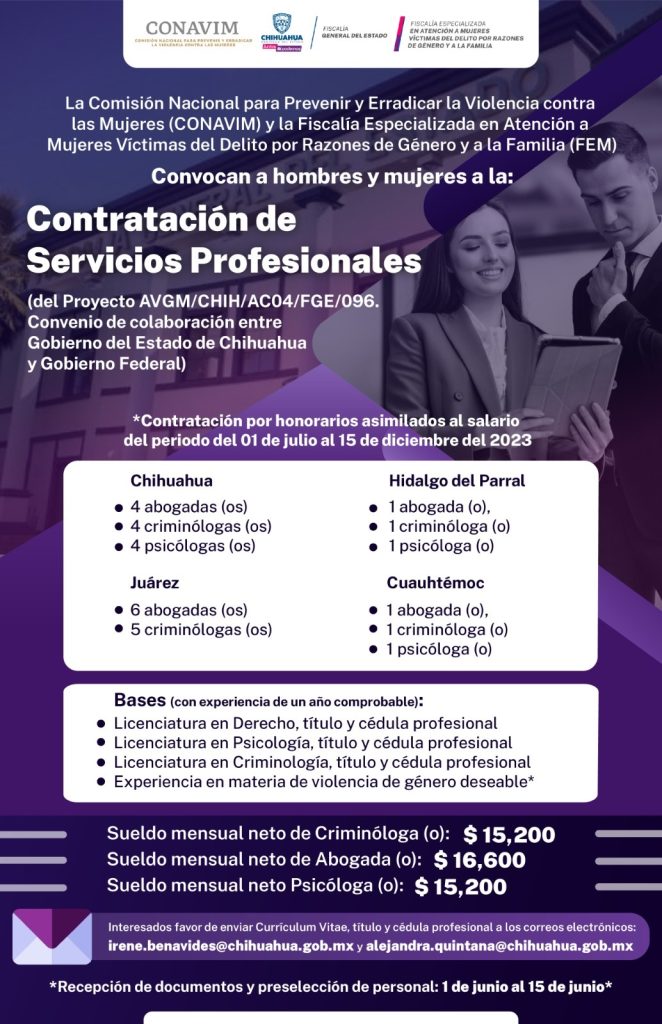 Como parte de los convenios de colaboración entre el Gobierno del Estado de Chihuahua y el Gobierno Federal, a través de la Secretaría de Gobernación y la Fiscalía General del Estado, se abrió una convocatoria pública para la contratación de 29 profesionistas especializados en Derecho y Psicología, para el abordaje de carpetas de investigación de los Delitos de Género.