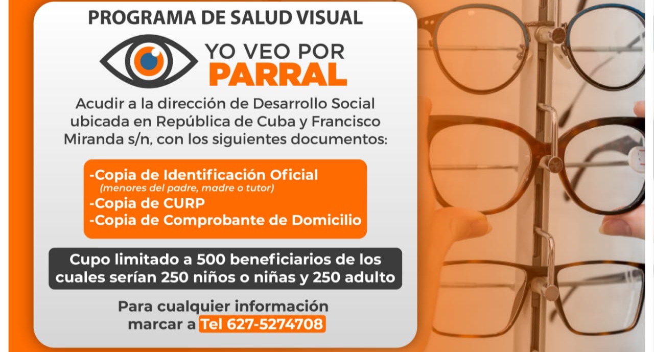 El Gobierno de Parral invita a la ciudadanía que requiera de apoyo para lentes a que se registre en las oficinas de Desarrollo Social en el programa de Salud Visual “Yo veo por Parral”, con el fin de recibir el apoyo, el número total de beneficiarios será de 500.
