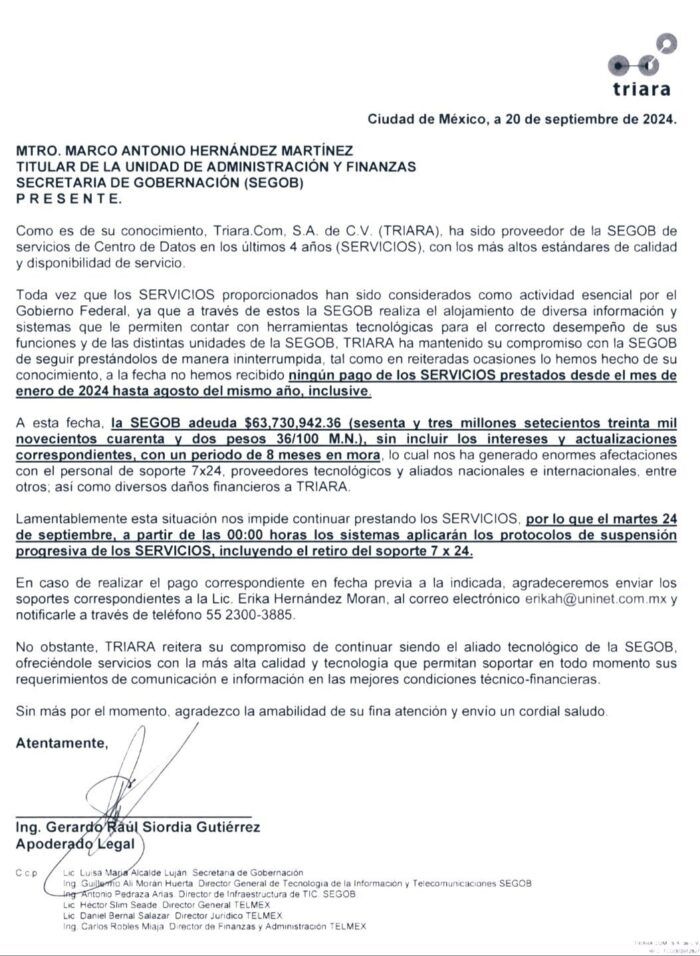 Según un oficio dirigido a la Unidad de Administración y Finanzas de la Segob, desde el 20 de septiembre pasado, la empresa Triara, parte de Telmex, cuyo apoderado legal es Gerardo Siordia Gutiérrez, notificó a la dependencia encabezada por Luisa María Alcalde Luján, sobre un adeudo de 63 millones 730 mil pesos, sin incluir intereses ni actualizaciones.