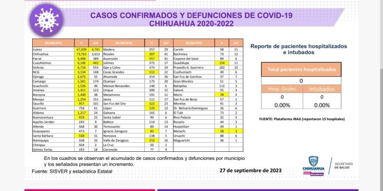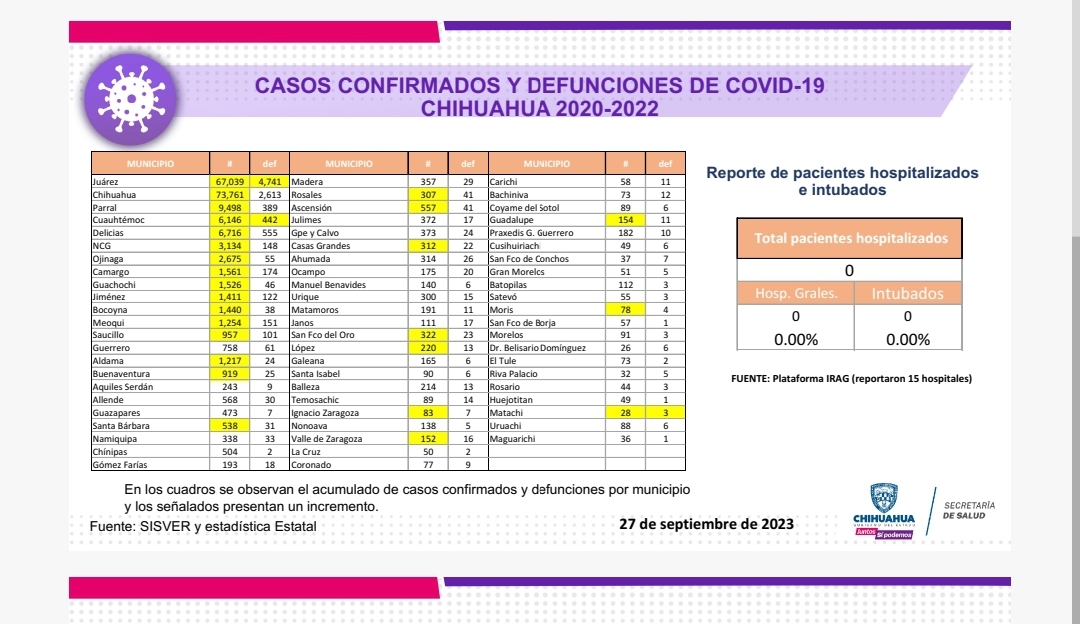 A partir del reporte emitido el 30 de agosto y con corte el 27 de septiembre, la cantidad de casos confirmados con este padecimiento ascendió a 189 mil 440 (+1,042), los cuales corresponden a los municipios de Juárez (+371), Chihuahua (+456), Parral (+53), Cuauhtémoc (+12), Delicias (+27), Nuevo Casas Grandes (+31), Ojinaga (+36), Camargo (+6), Guachochi (+4), Jiménez (+8), Bocoyna (+1), Meoqui (+3), Saucillo (+4), Aldama (+4) y Buenaventura (+7).