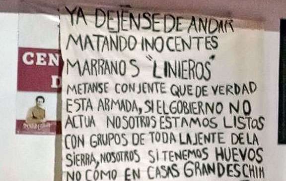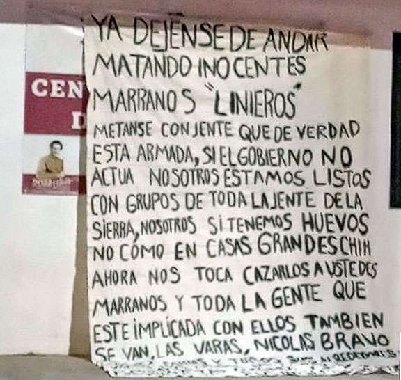 “Ya déjense de andar matando inocentes marranos “Linieros”. Métanse con gente que de verdad esta armada, si el gobierno no actúa nosotros estamos listos con grupos de tora la gente de la sierra, nosotros si tenemos huevos no como en Casas Grandes Chih. Ahora nos toca cazarlos a ustedes marranos y toda la gente que esté implicada con ellos también se va, Las Varas, Nicolás Bravo”, se alcanza a leer en la manta.