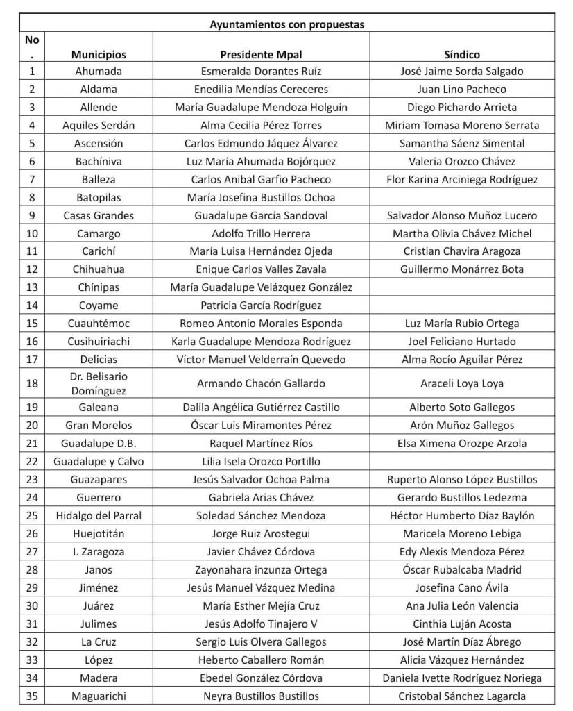 Destacan, entre otros, el exsíndico priista ‘Kike’ Valles para la Presidencia Municipal de Chihuahua capital; Esther Mejía para la Ciudad Juárez; Sol Sánchez para el municipio de Parral; y la expriista Perla Yáñez para Matamoros.