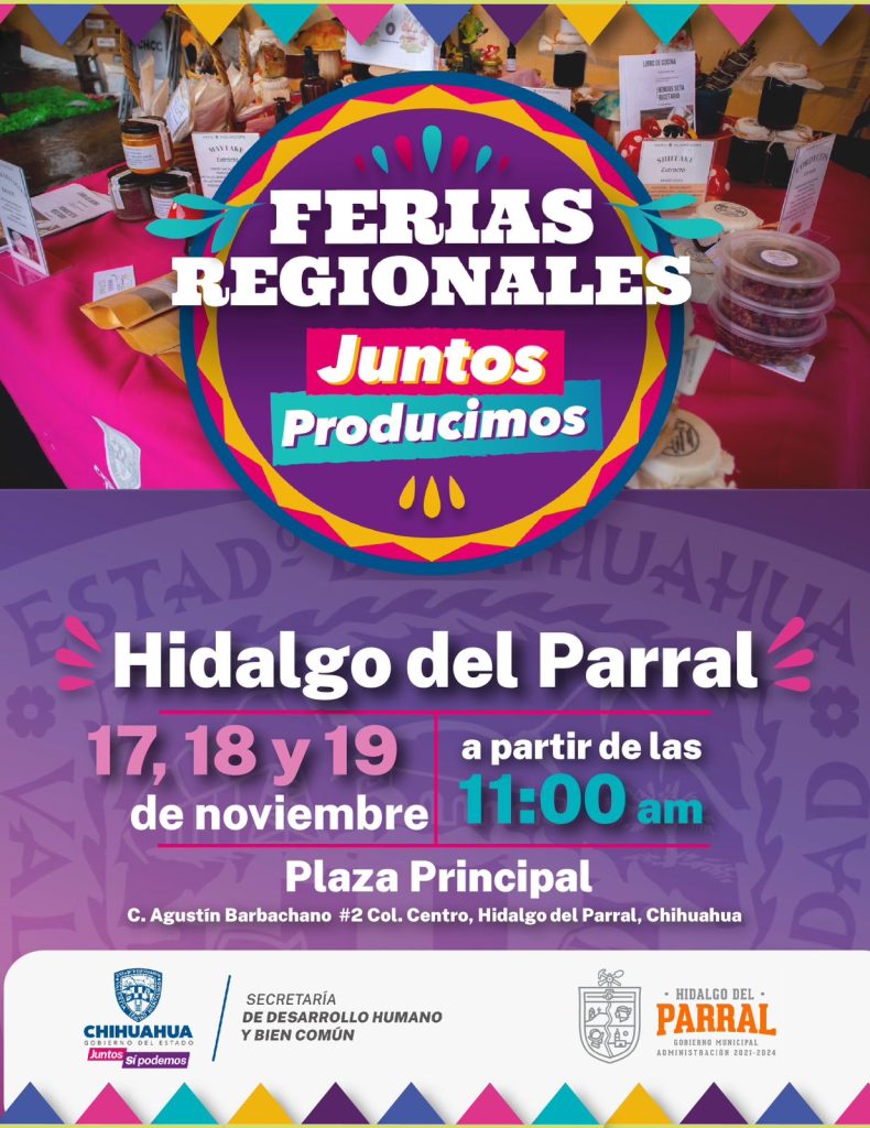 aría de Desarrollo Humano y Bien Común (SDHyBC) en coordinación con el Gobierno Municipal, invita a la “Feria Juntos Producimos”, en el municipio de Hidalgo del Parral.