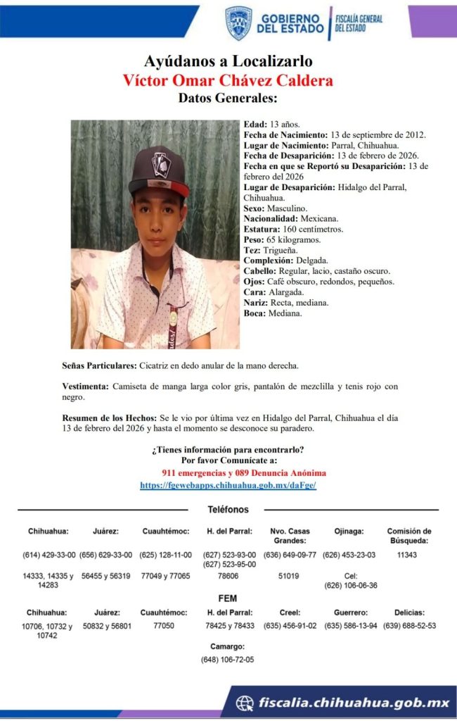 Autoridades activaron los protocolos de búsqueda para localizar a Víctor Omar Chávez Caldera, adolescente de 13 años de edad, quien fue reportado como desaparecido el 13 de febrero de 2026 en Hidalgo del Parral, Chihuahua.