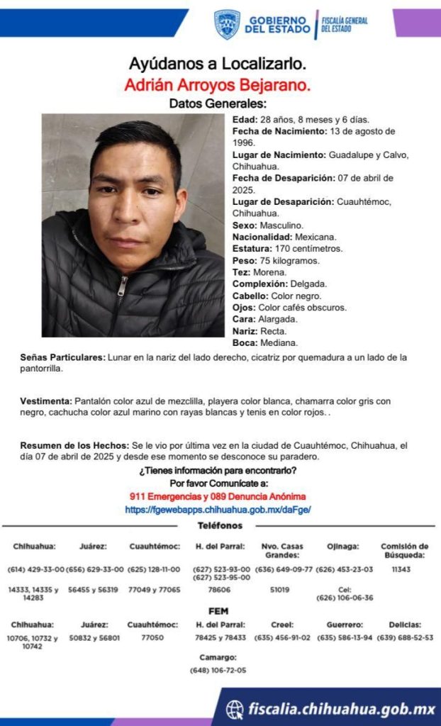Un hombre identificado como Adrián Arroyos Bejarano, de 28 años de edad y originario de Guadalupe y Calvo, fue reportado como desaparecido desde el pasado 7 de abril en el municipio de Cuauhtémoc.