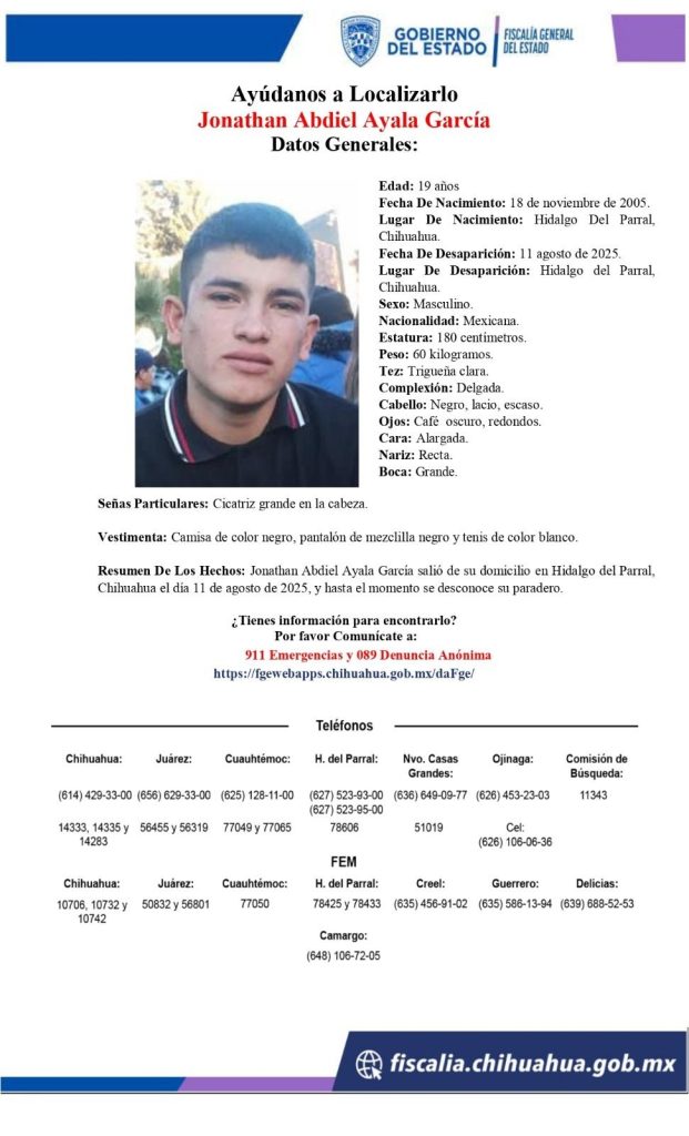 Autoridades de la Fiscalía General del Estado y familiares solicitan la colaboración de la ciudadanía para dar con el paradero de Jonathan Abdiel Ayala García, de 19 años, quien fue visto por última vez el pasado 11 de agosto de 2025 en Hidalgo del Parral.