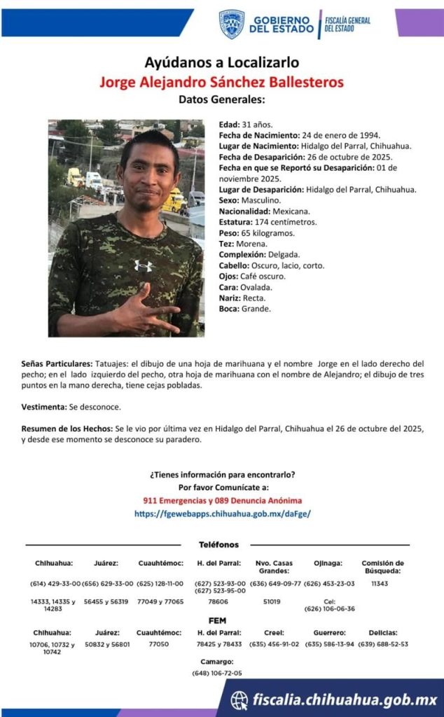 La Comisión de Búsqueda de Personas del Estado de Chihuahua solicita el apoyo de la ciudadanía para dar con el paradero de Jorge Alejandro Sánchez Ballesteros, de 31 años, quien fue visto por última vez el 26 de octubre de 2025 en Hidalgo del Parral, sin que hasta la fecha se tenga noticia de su ubicación.