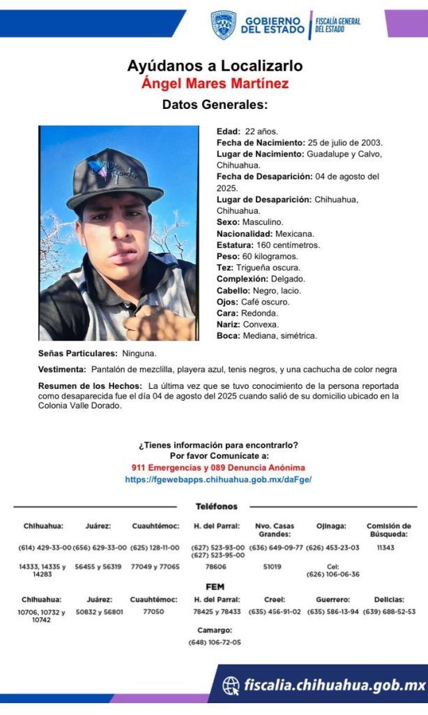 La Fiscalía General del Estado de Chihuahua emitió una pesquisa para localizar a Ángel Mares Martínez, de 22 años, quien fue visto por última vez el pasado 4 de agosto de 2025 en la colonia Valle Dorado, en la ciudad de Chihuahua.