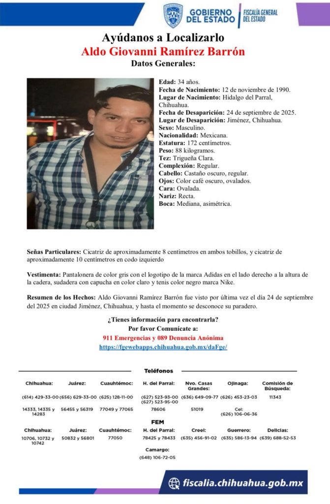 La Fiscalía General del Estado emitió una pesquisa para dar con el paradero de Aldo Giovanni Ramírez Barrón, de 34 años de edad, quien fue visto por última vez el pasado 24 de septiembre de 2025 en ciudad Jiménez, Chihuahua, y desde entonces se desconoce su paradero.