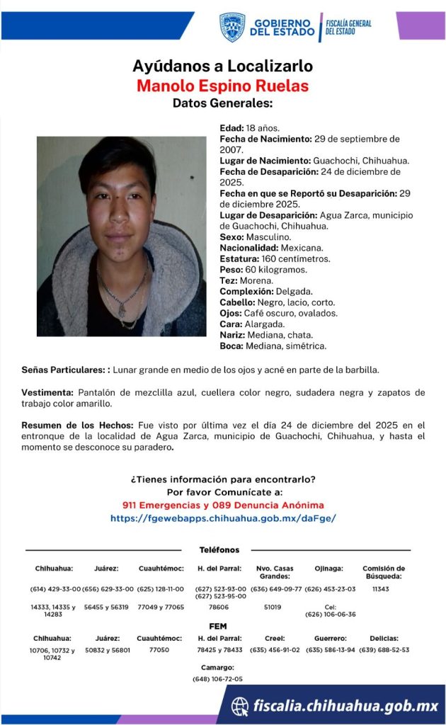El primero de los casos es el de Manolo Espino Ruelas, de 18 años, quien fue visto por última vez el 24 de diciembre en el entronque de la localidad de Agua Zarca, municipio de Guachochi. El joven vestía pantalón de mezclilla azul, cuellera negra, sudadera negra y zapatos de trabajo color amarillo. Como señas particulares, presenta un lunar grande entre los ojos y acné en la barbilla.