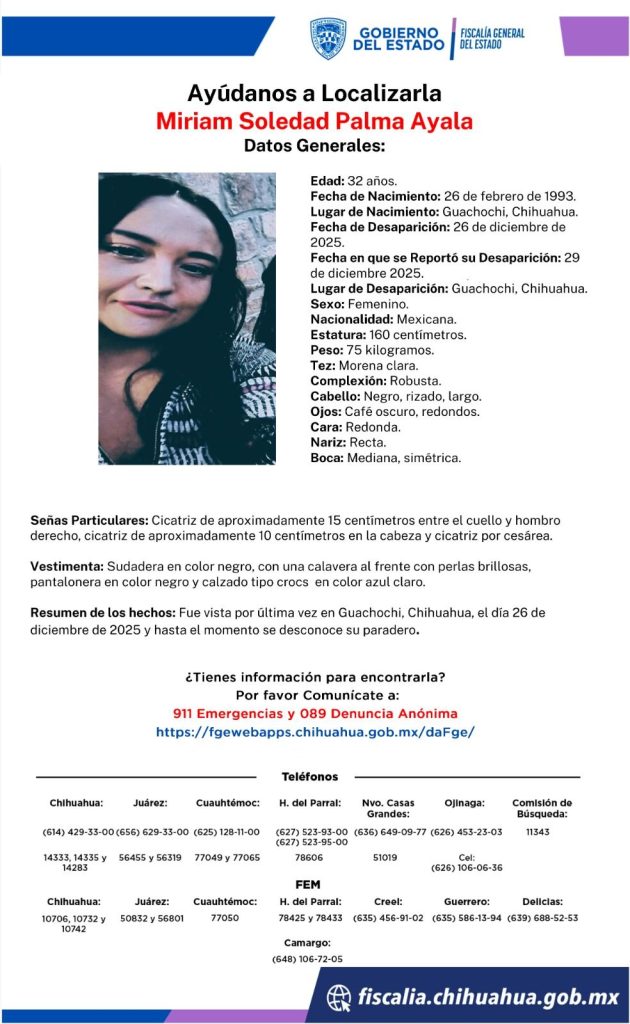Tres personas originarias del municipio de Guachochi fueron reportadas como desaparecidas entre el 24 y el 26 de diciembre de 2025, en distintos puntos de la región, lo que ha encendido las alertas de familiares y autoridades, aunque hasta el momento no se ha confirmado oficialmente que los casos estén relacionados.