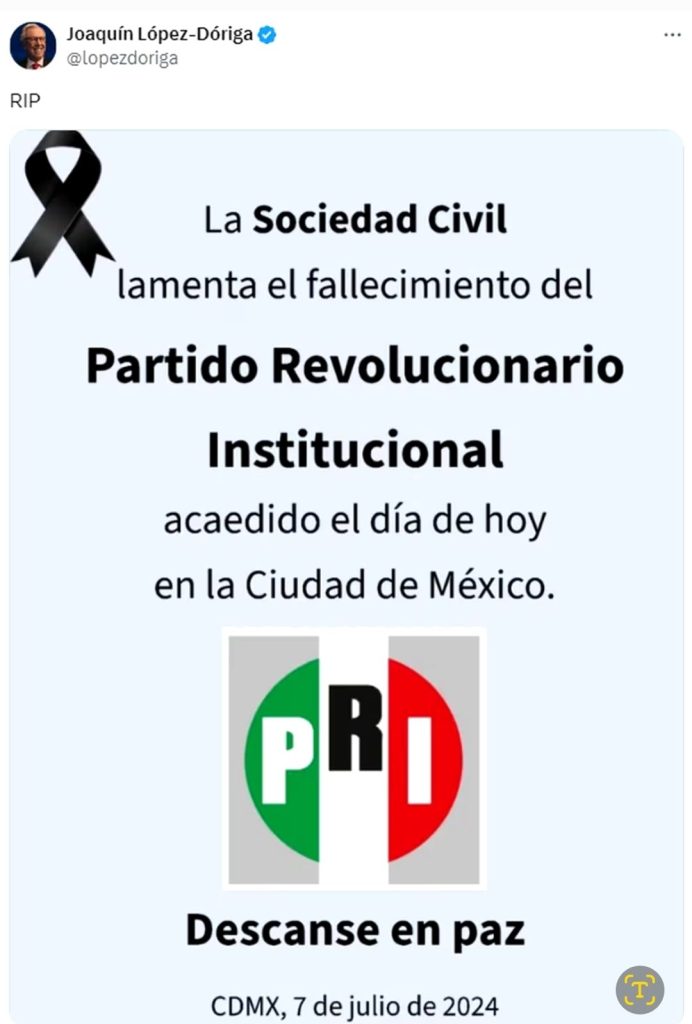 “La Sociedad Civil lamenta el fallecimiento del Partido Revolucionario Institucional acaecido el día de hoy en la Ciudad de México. Descanse en paz. CDMX, 7 de julio de 2024″, se puede leer en la imagen que compartió tras darse a conocer la noticias.